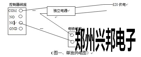 2、 鎖到控制器的連接線需采用2芯電源線,控制器到鎖距離不可以超過100米,線徑大于1.0 mm。如有需門磁檢測線則需多2芯線。(可根據現場需要定)。如果輸出12V電源有明顯降壓則可以微調電源電壓到13.6V或單獨給電鎖供電(如圖一)。