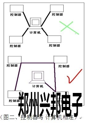 控制器GND 485- 485+分別對應連接485轉換器GND TD(A) TD(B),通訊線路采用串聯掛接式連接,請勿采用星型連接或者局部星型連接(如圖二)。如果線路過長和設備過多,請在最后一臺設備上增加終端電阻(有跳線加載)總線最多可掛接128臺控制器。