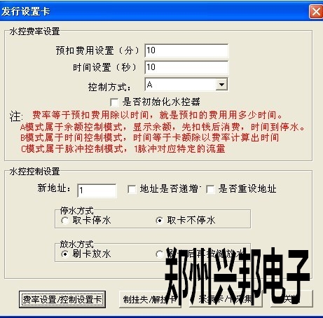 3. 水控控制設(shè)置可以更改水控機的機器號還有流水方式和停水方式;如果想更改水控機的機器號必須選擇是否重設(shè)地址;地址是否遞增,當(dāng)勾選上時,機器每刷一次控制卡機器號就會增1;根據(jù)所需設(shè)置好后,點擊費率設(shè)置/控制設(shè)置卡,選擇控制設(shè)置卡即可;只更改流水/停水方式時,在機器上刷控制卡時顯示9 10 ok,如果更改機器號,刷控制卡時顯示8 9 10 ok。
