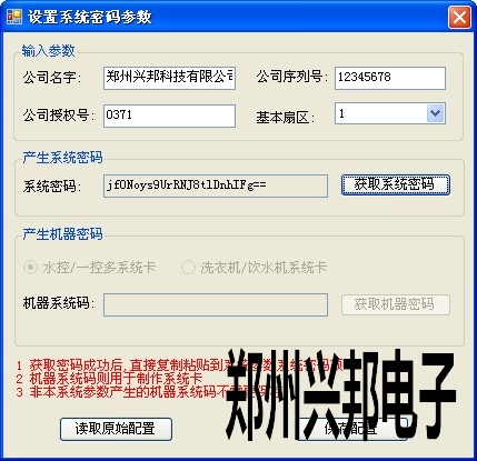4) 系統(tǒng)密碼:跟卡的加密有關(guān),單擊【設(shè)置密碼】出現(xiàn)圖5 輸入卡的加密參數(shù)(根據(jù)公司所提供的信息填寫),單擊【獲取系統(tǒng)密碼】,單擊【保存配置】。將獲取的密碼粘貼到系統(tǒng)密碼后面的空白處。再次打開該窗口時可以單擊【讀取原始密碼】,獲得卡的加密信息。