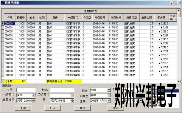 1) 消費明細表:根據相應條件查看卡的消費明細,表里顯示了卡的一些基本信息和消費的時間,金額和卡上還有的余額。