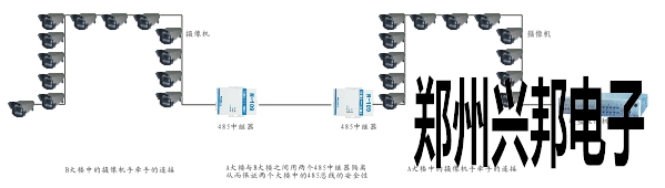 施工方采用485中繼器解決上述問題。在A,B教學樓里面各放一個485中繼器,等于把一個485網絡分成了3個485網絡,這樣485網絡就可以很穩定的運行。再由于教學樓之間的200m的距離是在兩個485中繼器中間,即使有強電干擾,由于485中繼器中防雷保護和光隔離功能,也會被其所吸收,隔離。從而保證了485網絡的穩定性及安全性。