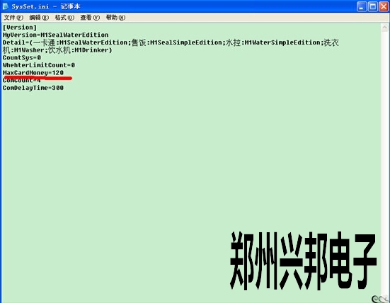 電腦桌面上找到485售飯機(jī)軟件圖標(biāo),然后光標(biāo)停在此軟件圖標(biāo)上右擊--屬性--查找根目錄,點(diǎn)開(kāi)后打開(kāi)軟件文件夾,也就是找到帶有軟件圖標(biāo)的文件夾,然后找到SYSSET.INI此文件,雙擊打開(kāi),把MAXCARDMONEY=XX,更改成自己所需要的即可,如下圖:有一卡通,售飯,水控,洗衣機(jī),飲水機(jī)等相關(guān)的中文數(shù)字,現(xiàn)在只需要把maxcardmoney=120,此時(shí)卡上總額最多只能存款為120,超過(guò)此金額就無(wú)法存款。