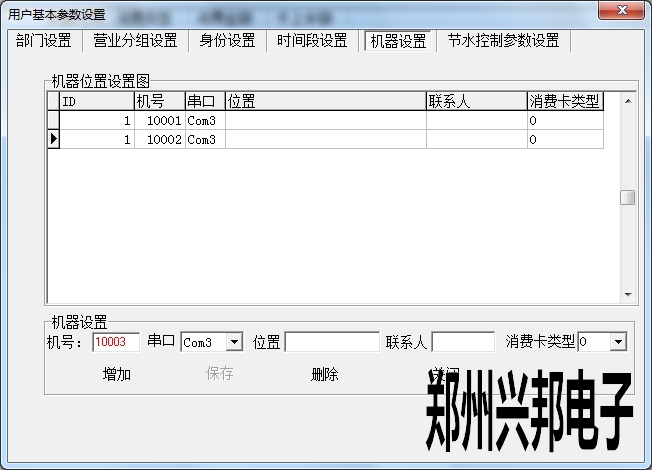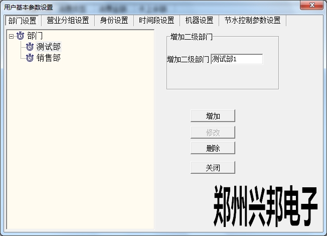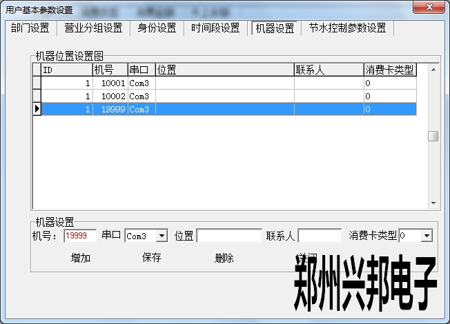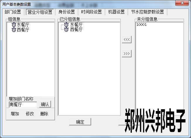 在使用興邦一卡通平臺(tái)用戶(hù)基本參數(shù)設(shè)置中有部門(mén)設(shè)置、營(yíng)業(yè)分組設(shè)置、身份設(shè)置、時(shí)間段設(shè)置、機(jī)器設(shè)置、節(jié)水控制參數(shù)設(shè)置。下面依次為其說(shuō)明。