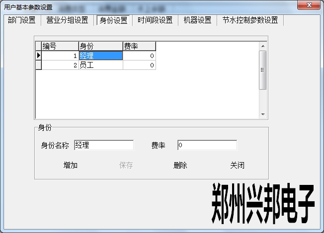 身份設(shè)置是對(duì)持卡人身份的說(shuō)明,通過(guò)讀卡可以看到此人的身份。直接輸入身份名稱(chēng),費(fèi)率填寫(xiě)0,暫不起作用,點(diǎn)擊增加,增加成功后,選中信息進(jìn)行雙擊可以對(duì)身份名稱(chēng)進(jìn)行修改,也可以刪除。