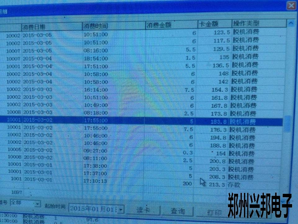 讓客戶在軟件里面查看一下個(gè)人明細(xì)表,選擇這張卡從開卡到現(xiàn)在的時(shí)間段,從下往上看,因采集的時(shí)候只顯示到分,沒有顯示到秒,所以看數(shù)據(jù)的時(shí)候要在同一日期的往上看一下,有的是沒有按順序排列的。像圖上所示的,所選擇的這一列應(yīng)該是比下面的這一列先消費(fèi)的。還有一條是10005號的對不上,5號機(jī)應(yīng)該是時(shí)間錯(cuò)誤了,這條應(yīng)該是3月3 號的消費(fèi)數(shù)據(jù)。把5號機(jī)校一下時(shí),下載一下參數(shù)就可以了。這種問題就解決了。