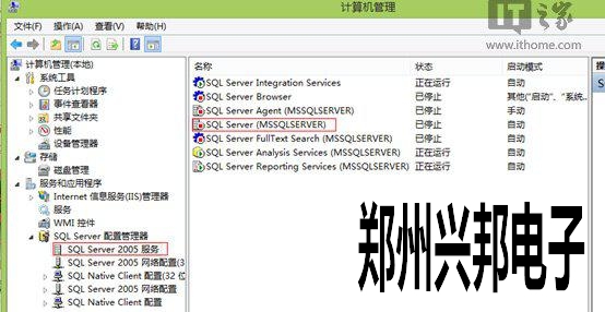 8、當完成SQL Server 2005安裝后,先不啟動套件,而是先強制停止SQL Server的服務項目。(進入計算機管理,選擇SQL Server配置管理器,禁止SQL Server 2005相應的服務項目)