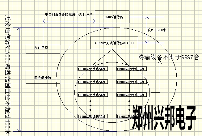 433MHZ無線通信器(WLA001)使用框圖如下所示,一個433MHZ無線通信器(WLA001)的無線覆蓋范圍為直經(jīng)400米(空曠地區(qū));只要在收發(fā)的范圍內(nèi),可連接的終端設(shè)備的臺數(shù)理論上沒有限制;地址號9998、9999,終端設(shè)備不可用,系統(tǒng)使用;