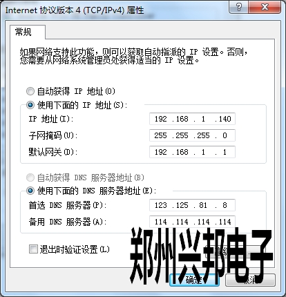 3、子網掩碼采用默認設置,網關填寫要與網段一致,192.168. 所才網關 .1。